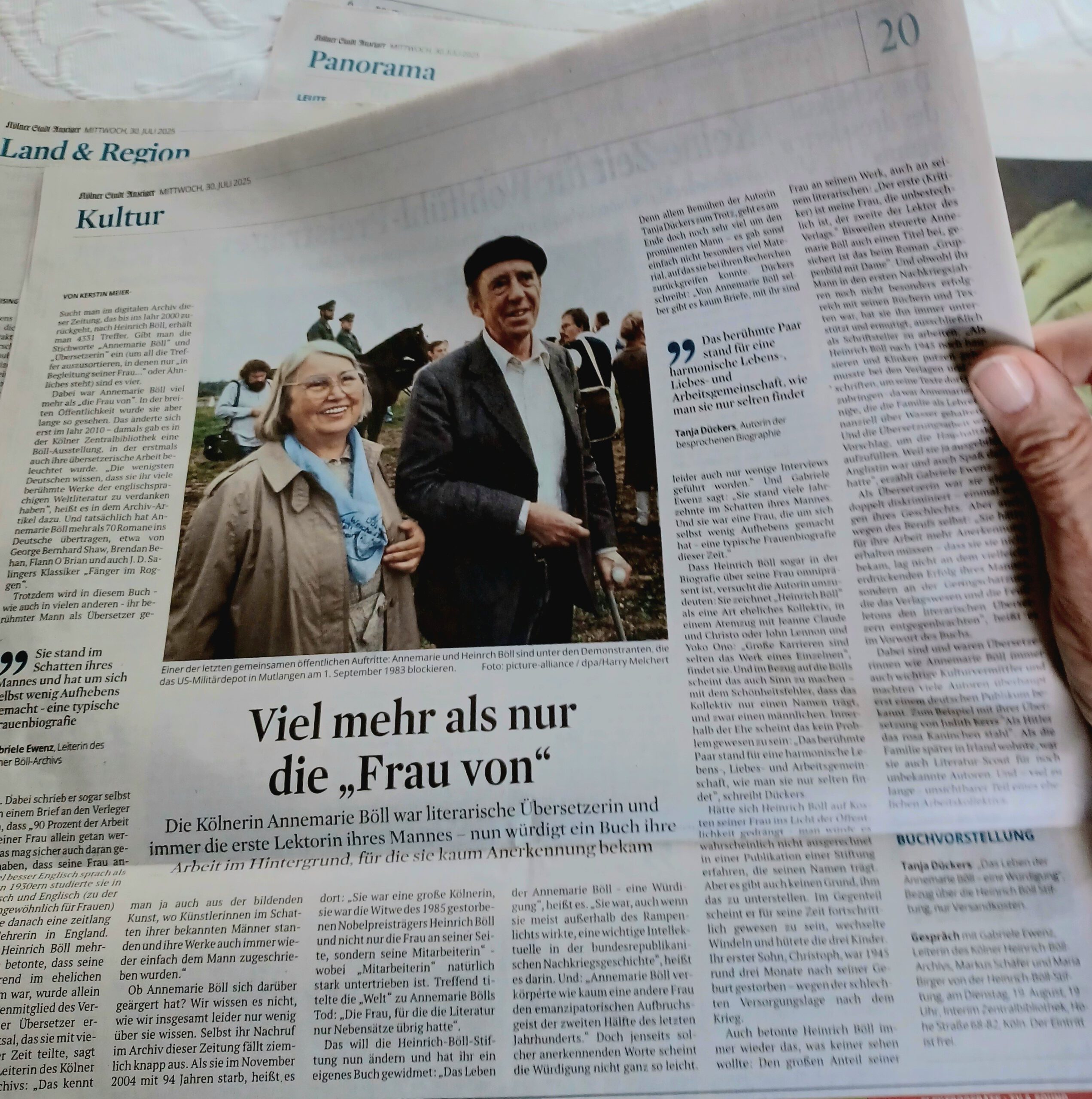 Im Kölner Stadt-Anzeiger springt mir heute ein Artikel über das Ehepaar Böll ins Auge, der Heinrichs Ehefrau Annemarie und ihre Rolle beleuchtet: „Viel mehr als nur die „Frau von“.