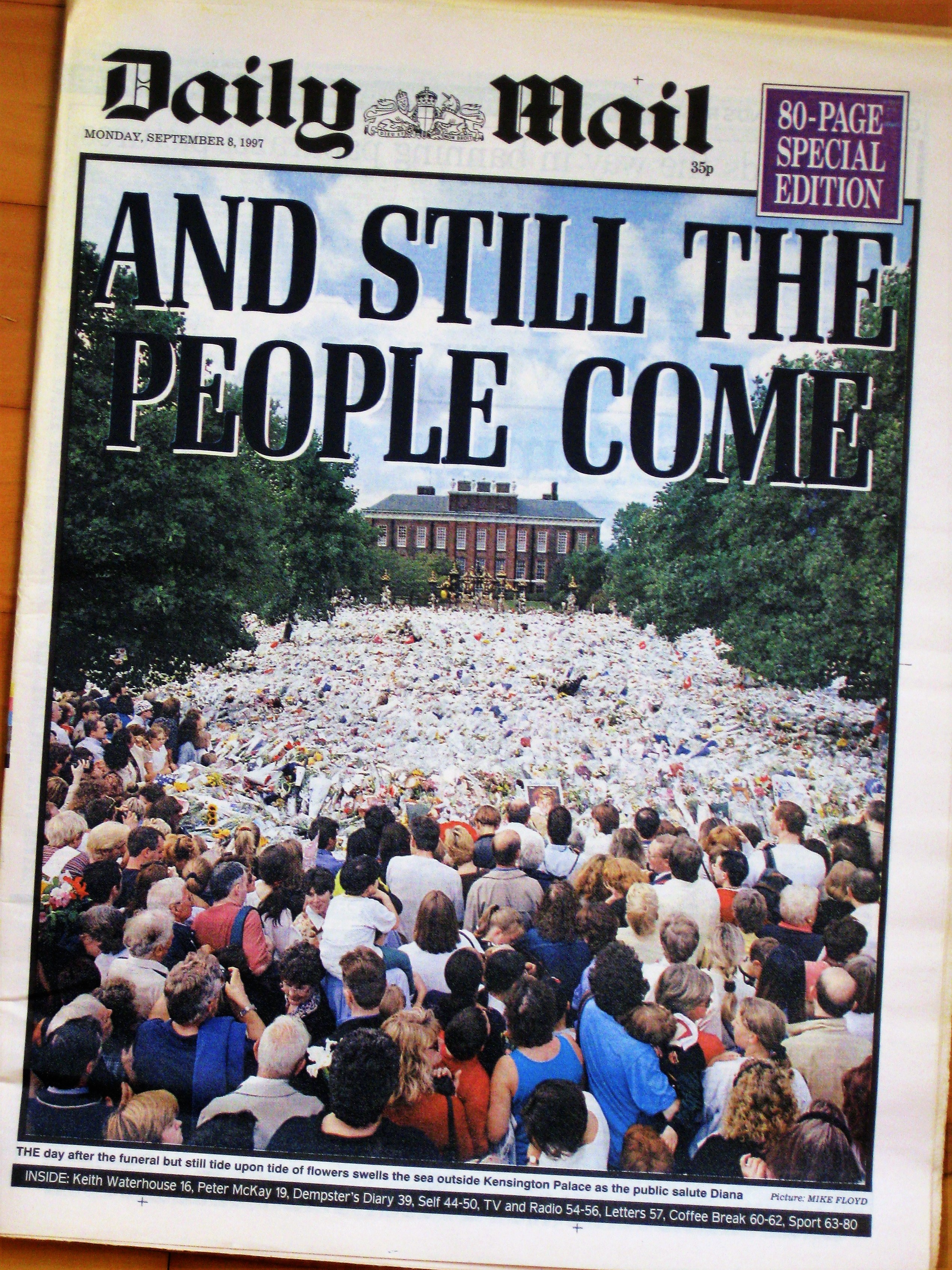 Ich sah nach dem Wochenende des Trauergottesdienstes: Die Schlagzeile oben hatte recht, überall, wo Blumen für Diana niedergelegt wurden, teils mit ihrem Foto und letzten Grüßen, kamen weiterhin Menschen, um ihre Trauer zu bekunden, und ließen das Blumenmeer weiter anwachsen. Den Skeptikern, die darüber den Kopf schüttelten, kann man mit einem Goethe-Zitat nur sagen: „Wenn ihr’s nicht fühlt, ihr werdet’s nicht erjagen.“